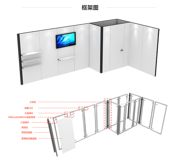 走線纜,框體之間由螺絲鏈接而成,框體外部可粘貼雪芙板畫面、木結(jié)構(gòu)板材及噴繪布及燈箱,可以組合層板、AV設(shè)備及其他沖