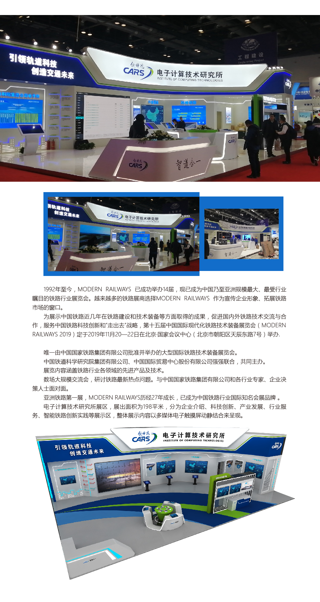 電子計(jì)算技術(shù)研究所展區(qū),展出面積為198平米,分為企業(yè)介紹、科技創(chuàng)新、產(chǎn)業(yè)發(fā)展、行業(yè)服務(wù)、智能鐵路創(chuàng)新實(shí)踐等展示區(qū),整體展示內(nèi)容以多媒體電子觸摸屏動靜結(jié)合來呈現(xiàn)。