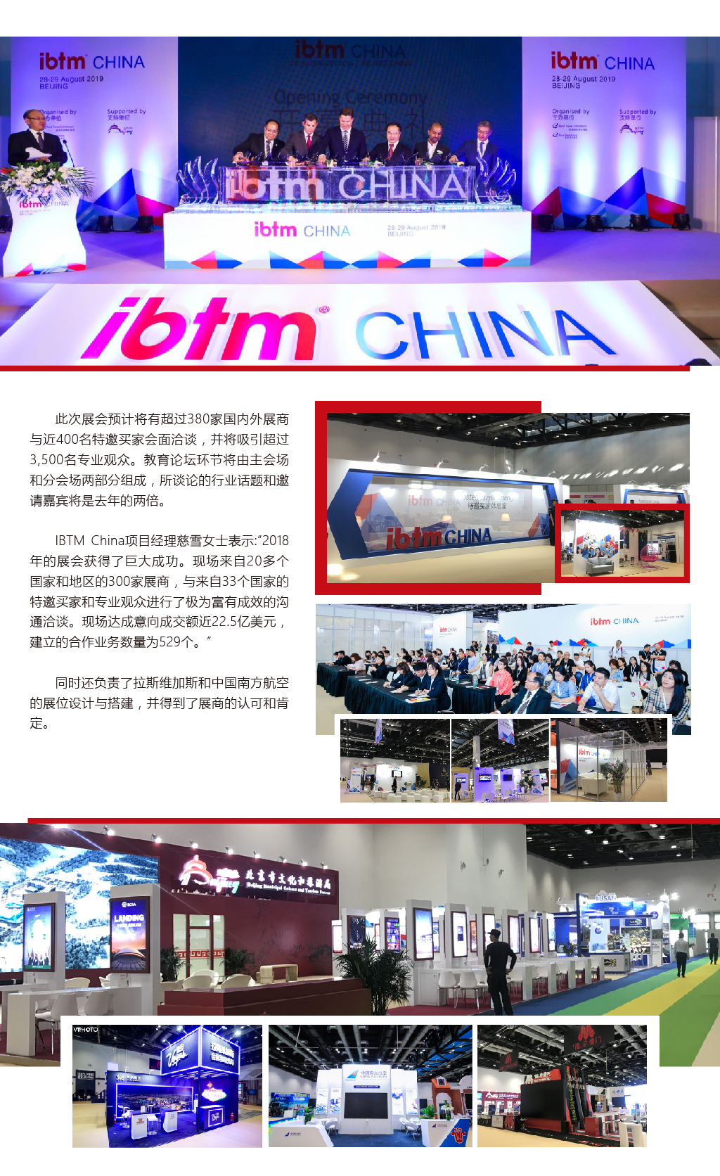 IBTM China作為勵(lì)展旅游展覽集團(tuán)旗下ibtm®系列展覽的中國(guó)站 -- 首次披露其2019年展會(huì)具體信息。主辦方明年將增大國(guó)內(nèi)二三線城市和亞太區(qū)域內(nèi)特邀買(mǎi)家的邀請(qǐng)比例。引進(jìn)“Happy Hour”環(huán)節(jié)并增設(shè)“互動(dòng)體驗(yàn)區(qū)”,增強(qiáng)展商和特邀買(mǎi)家的現(xiàn)場(chǎng)多維互動(dòng),力圖通過(guò)創(chuàng)造一系列全新社交活動(dòng)以促進(jìn)展商和買(mǎi)家建立有效的商務(wù)合作。盛典公司為本次展會(huì)提供了主場(chǎng)運(yùn)營(yíng)及主場(chǎng)搭建服務(wù),同時(shí)負(fù)責(zé)拉斯維加斯會(huì)展和觀光局、海南航空展臺(tái)的搭建,獲得了展商及主辦方的認(rèn)可。